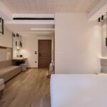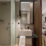 Refresh in the sleek walk-in shower with free toiletries, and unwind in a cozy space with a sofa bed, soundproof windows, and elegant decor.